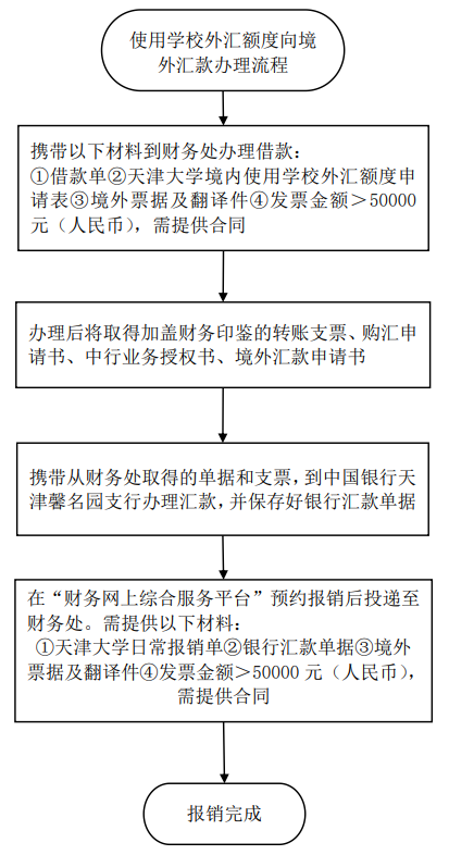 使用个人外汇额度支付时,可以使用个人银行卡通过网上银行转账方式汇款或者通过银行外汇业务窗口办理汇款,支付完成后可登录“财务处网上综合服务平台”进行日常预约报销。