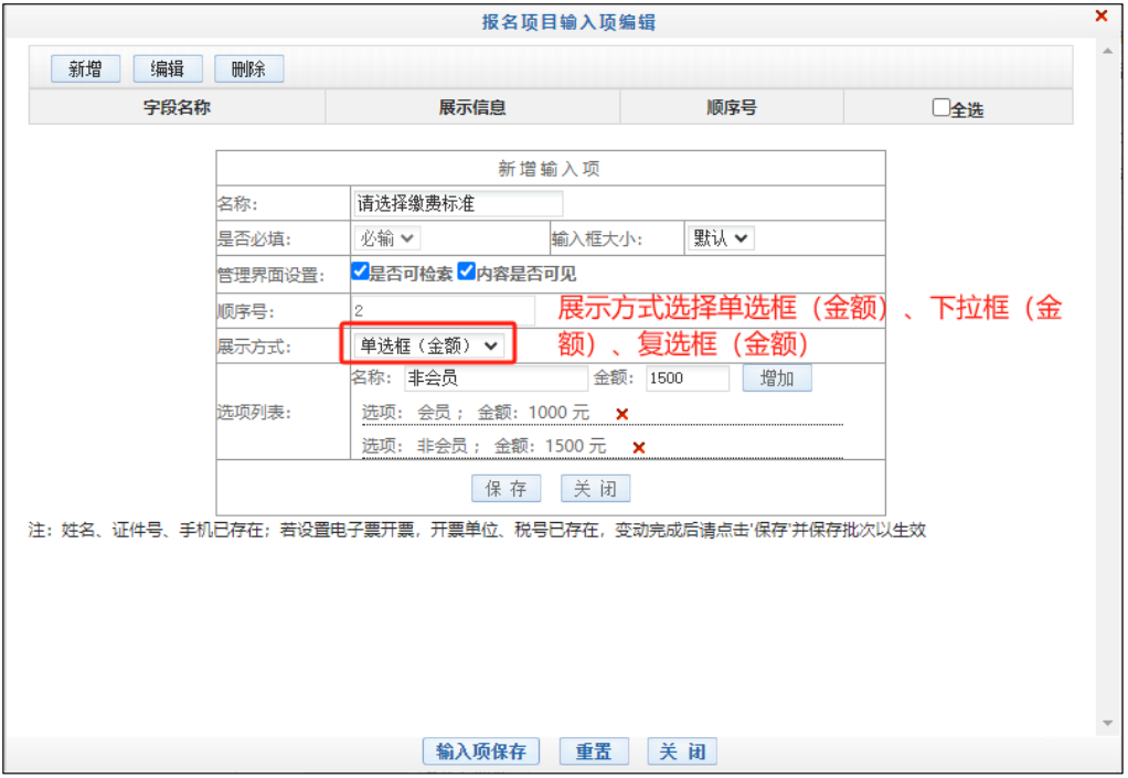 如存在收费标准不同的情况,可按上述方法新增信息采集项,展示方式需要选择“单选框(金额)”、“下拉框(金额)”、“复选框(金额)”。
