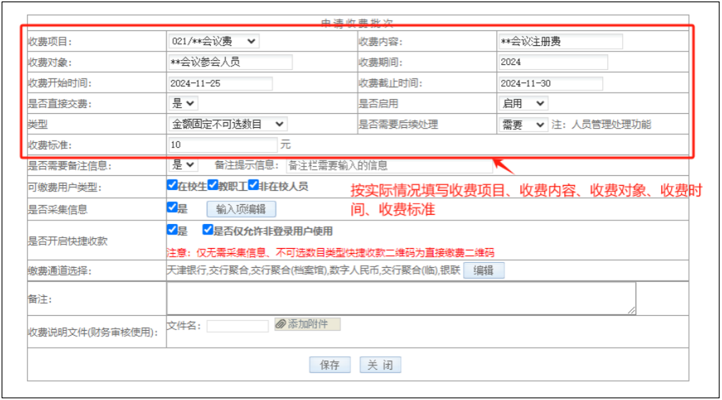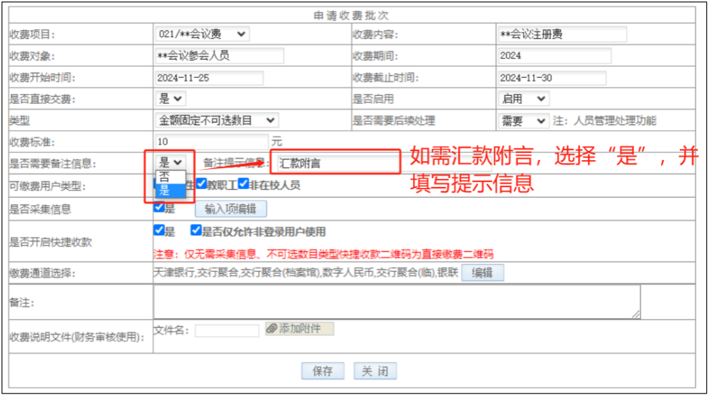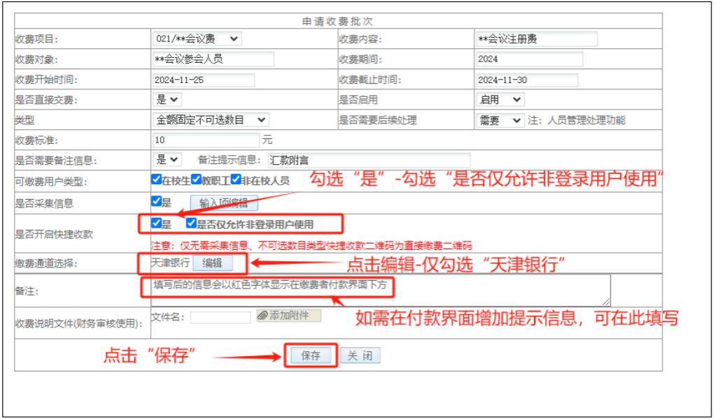 在“是否开启快捷收款”栏目勾选“是”-勾选“是否仅允许非登录用户使用”。在“缴费通道选择”栏目点击“编辑”只能选择“天津银行”。如需在付款界面增加提示信息,可在最下方“备注栏”填写提示内容,以上内容全部填写完成后点击“保存”,收费批次即申请成功。