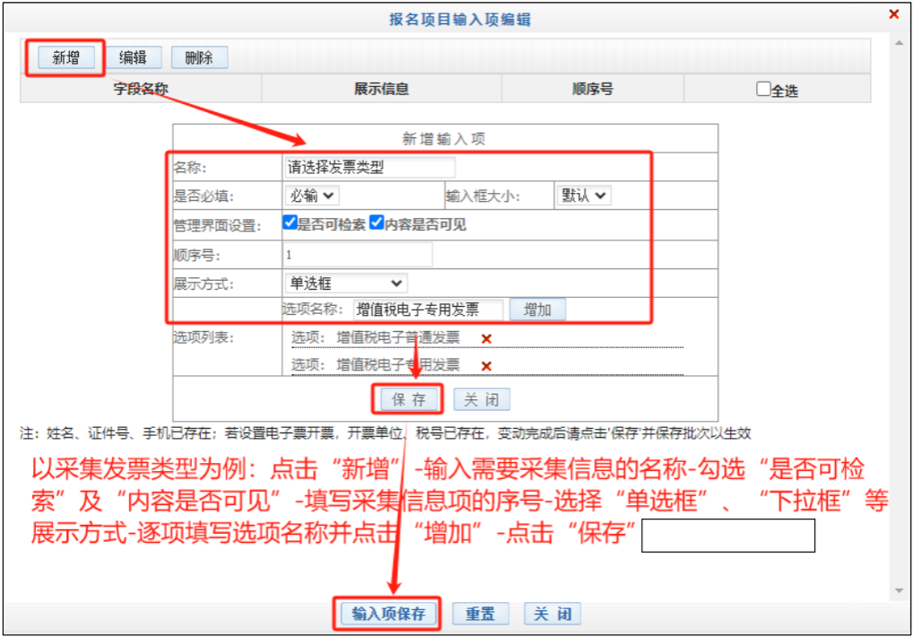以采集发票类型为例:点击“新增”-输入需要采集信息的名称-勾选“是否可检索”及“内容是否可见”-填写采集信息项的序号-“单选框”、“下拉框”等展示方式-逐项填写选项名称并点击“增加”-点击“保存”该信息采集项新增完毕,如有其他信息需要采集可继续点击增加按以上方法填写即可,所有信息采集项全部增加完毕后选择“输入项保存”。
