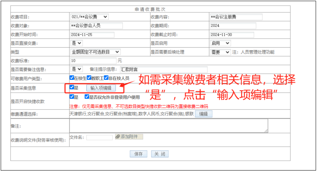 如需采集缴费者相关信息,在“是否采集信息”-选择“是”-“输入项编辑”。