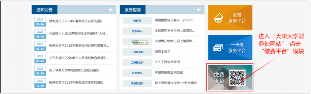 收费权限开通后业务员进行新增收费项目操作,进入“天津大学财务处网站” -点击“缴费平台”。
