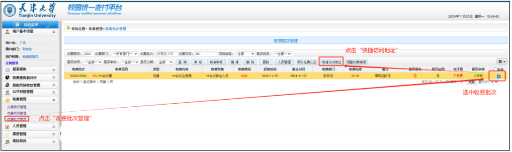 审核通过后,业务员按顺序选择“收费管理”-“收费批次管理”-勾选对应的收费批次-选择“快捷访问地址”即可获得收费二维码,缴款人可扫码支付会议费。
