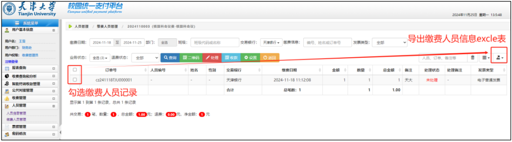 确认费用收齐后,勾选所有缴费人员信息并导出excle表,打印后加盖学院公章。