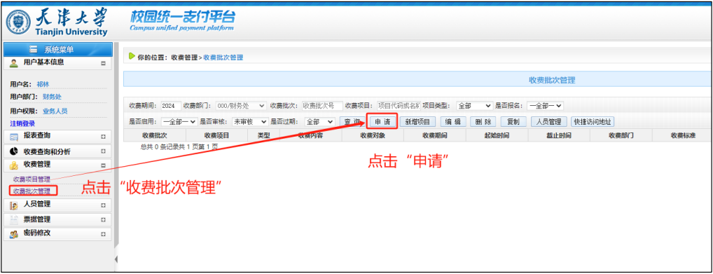 按顺序选择“收费管理”-“收费批次管理”-“申请”。同一收费项目下可按实际需要申请多个收费批次。