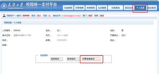 2. 更新个人信息:点击“开票信息修改”,填写个人信息(手机号和邮箱用于接收电子票据,务必准确填写;如需开单位抬头,请准确填写单位名称,否则开票后无法更改)