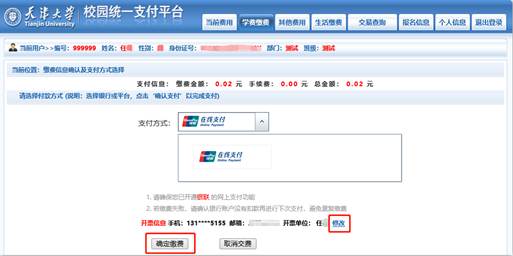5. 如手机号与邮箱信息有误,可点击“修改”更改信息,信息无误后点击“确定缴费”