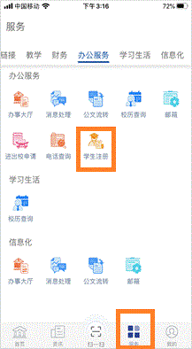 1、下载最新版本的融合门户APP,打开后点击底部“服务”标签。进入服务页面后,选择“办公服务”栏目中的“学生注册”,进入注册页面。