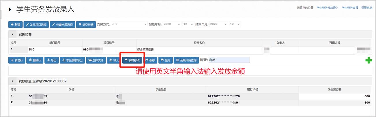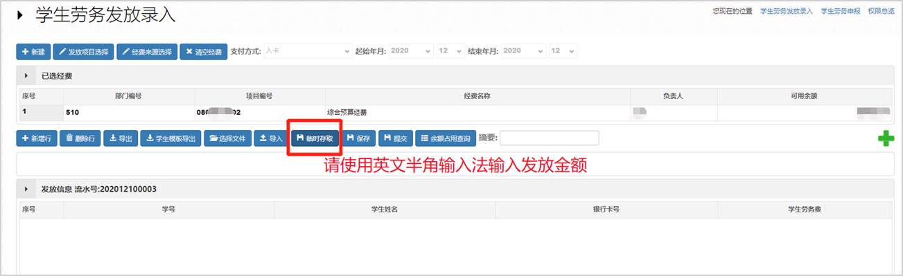 以学生劳务为例,首先,填写发放项目、经费来源,然后填写发放信息,录入学号和金额,如以后还需给相同的学生发放劳务,可在提交之前点击“临时存取”——“临时保存”按钮,将当前发放信息保存为模板。