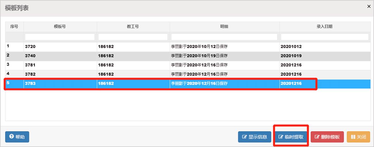 再次为相同的学生发放劳务费时,首先,填写发放项目、经费来源,然后,点击“临时存取”——“临时提取”按钮,从模板列表中选择相应模板,即可提取到学生信息。(选择模板,点击“显示信息”可查看详细内容),提取后,可修改金额等信息,然后按正常操作流程提交单据即可。