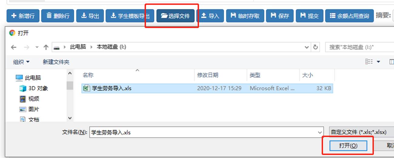 3. 在导出的模板中填写人员信息以及发放金额后,保存文件。在学生劳务发放录入页面,点击“选择文件”,选择保存好的模板文件,再点击“导入”,导入成功后,按申报流程提交即可。