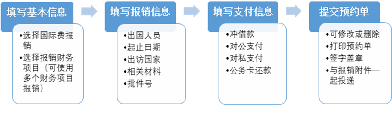 国际费报销是指因公临时出国所发生的国际旅费、国外城市间交通费、住宿费、伙食费、公杂费和其他费用等报销业务。国际费报销网上填写流程如下: