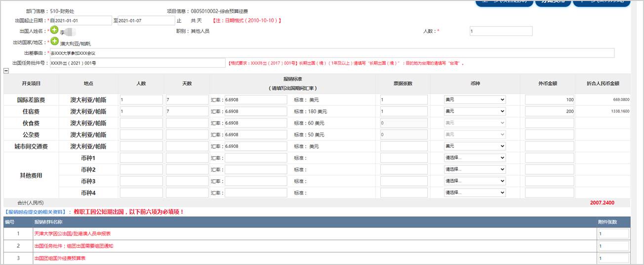 3. 填写国际费报销内容和报销金额,其中带“*”的为必填内容,包括“出国起止日期”、“出访国家/地区”、 “出国人姓名”、“出差事由”、“出国任务批件号”和“报销时应提交的相关资料”等;