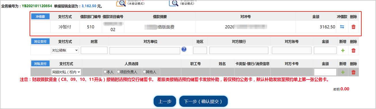 1. 新建日常报销业务,填写日常报销内容和报销金额,点击【下一步(支付方式)】,到支付方式页面;