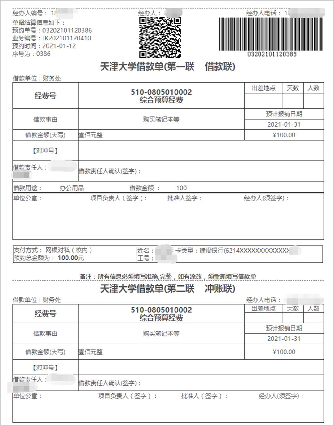 7. 将打印出来的借款单,签字盖章,将第一联撕下,和其他附加材料一起,投递至学院或财务处投递箱,第二联个人保存,待冲账时使用。
