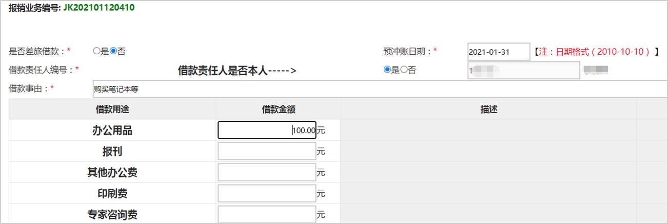 b)非差旅借款。借款用途如果为非差旅,“是否差旅借款”选择“否”。填写冲账日期、责任人、事由和借款金额等。