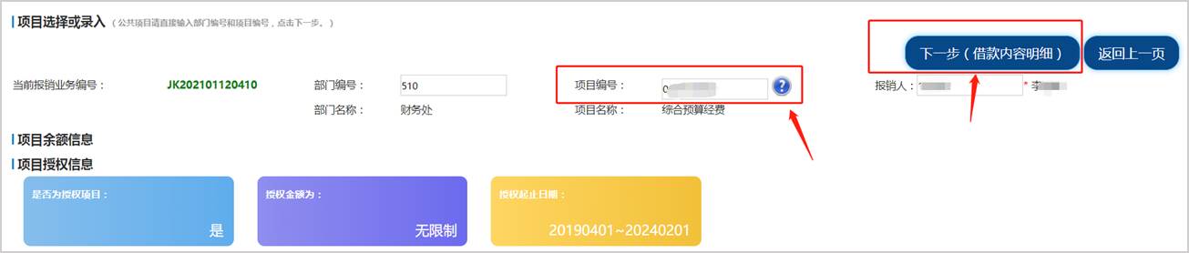 2. 点击项目编号右侧的“?”问号,选择借款所用的财务项目,然后点击【下一步(借款内容明细)】 ;