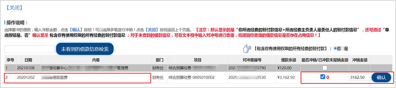 2. 选择支付方式为“冲借款”,然后选择需要冲账的借款记录,勾选“是否冲销”,填写冲销金额,然后点【确认】;