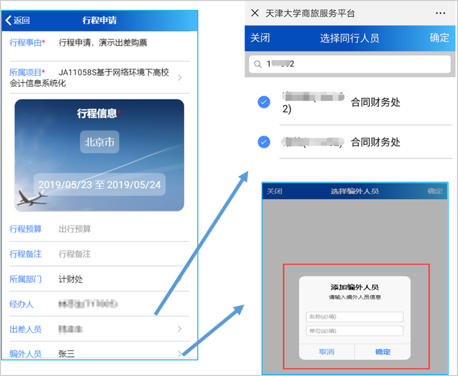 ⟡编外人员:如需添加校外人员出行。填写单位、姓名、职级。