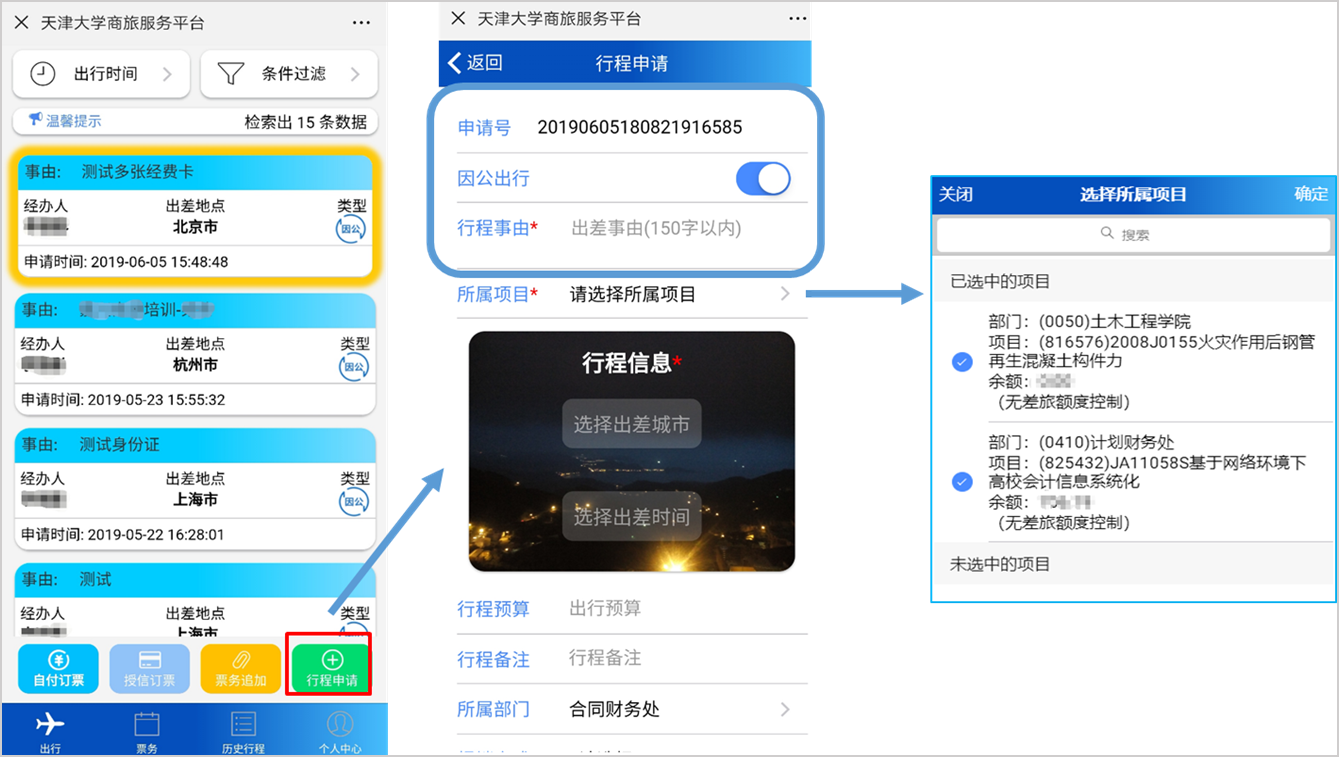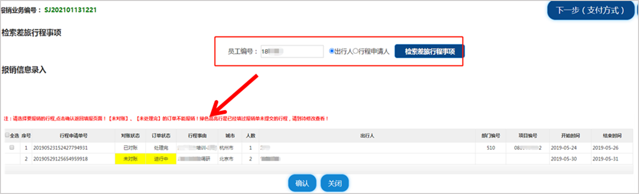 点击【新业务填报】,根据出行人或者经办人工资号,检索差旅行程事项。勾选要报销的行程,点击确认。