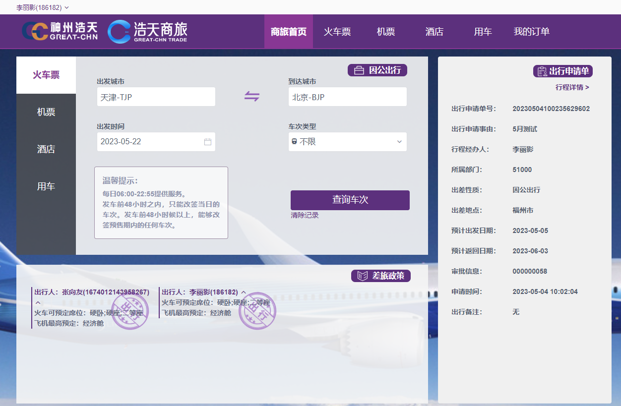 点击【差旅订票】,选择出发时间和地点,购买机票、酒店、火车票(火车票只能个人自付,如行程申请时选择了包干,住宿费也只能自付,其他情况均为系统垫付)。确认提交后会收到购票的短信通知。购票成功后,在商旅平台首页行程详情可查看购票的信息。