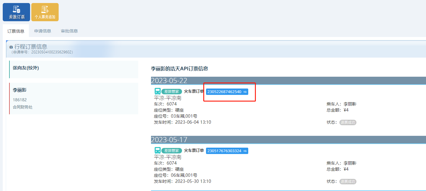 点击行程‘申请信息’可查看购买票务的信息。点击订单号可进行改签及退票操作。商旅平台也同时显示该票务的退票、改签信息。退改签手续费规则以购票时页面提示为准。