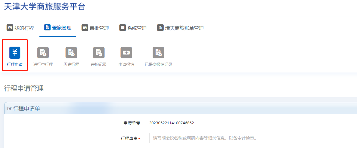 个人基本信息维护好之后,下一步建立差旅行程。点击【行程申请】,填写行程信息。