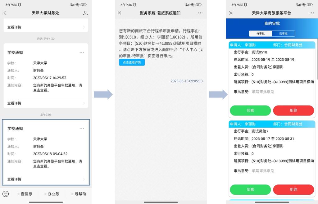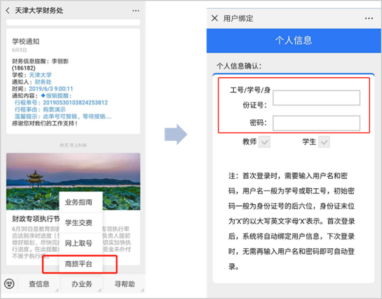 关注“天津大学财务处”微信公众号,选择菜单“办业务”—“商旅平台”。首次进入商旅平台,需要绑定个人信息,用户名和密码与财务平台一致。