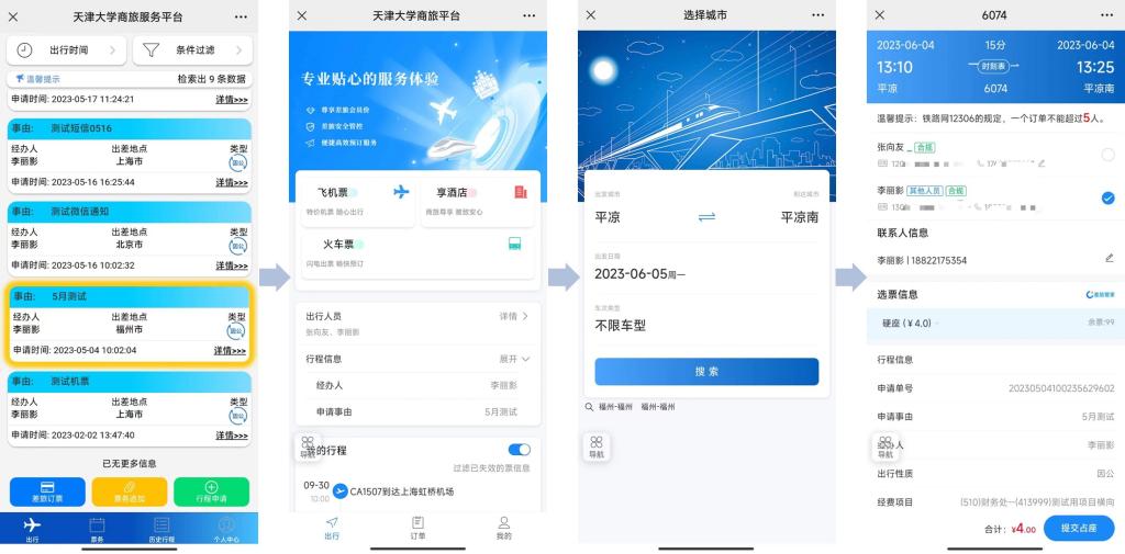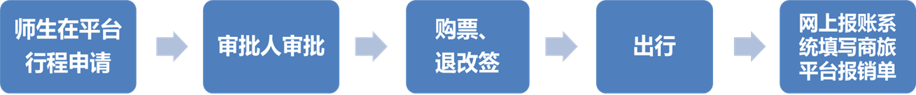 天津大学商旅服务平台面向全校师生,提供一站式差旅服务,师生下单即走,平台垫付资金(机票、酒店),并且由学校与供应商统一结算。系统内置火车票、机票、酒店等资源,线上购票,线上审批。出行结束后,在网上报账系统报销补助和其他费用。使用商旅平台的业务流程如下: