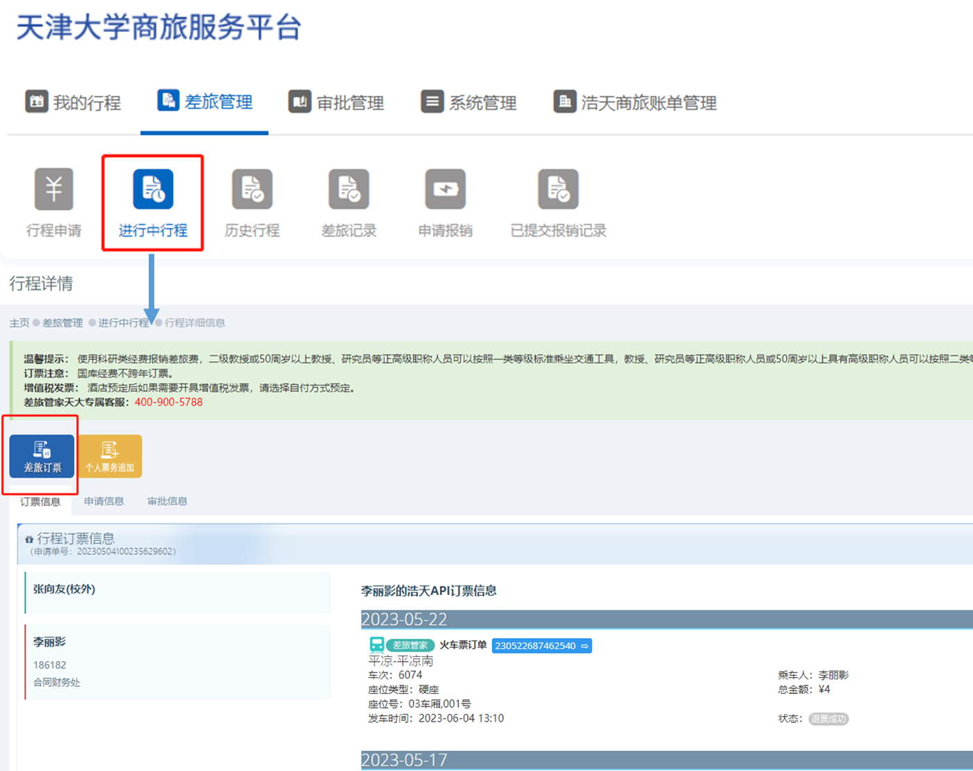 点击【进行中行程】,选中行程申请号,点击【差旅订票】(如果行程申请中住宿费选择了包干,只能选择【自付订票】),选择出发时间和地点,购买机票、酒店、火车票(火车票尚不支持垫付,只能个人自付)。确认提交后会收到购票的短信通知。购票成功后,在商旅平台首页行程的申请信息中可查看购票的信息。