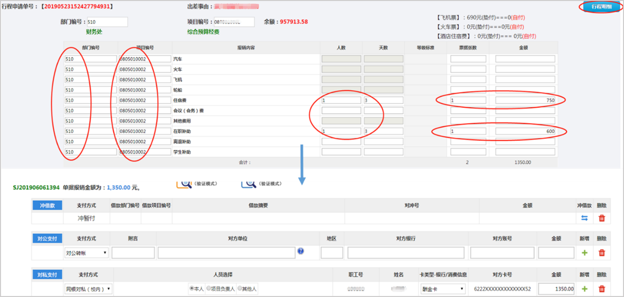 系统会根据订单信息,汇总商旅平台行程信息(财务项目、人数、天数、行程明细)。同时可填写未在商旅平台上预定的其他报销内容(如酒店住宿等)和差旅补助金额。点击【行程明细】可查看在商旅平台订票相应的信息。确定填报无误,点击【下一步(支付方式)】,进入支付方式填报页面。
