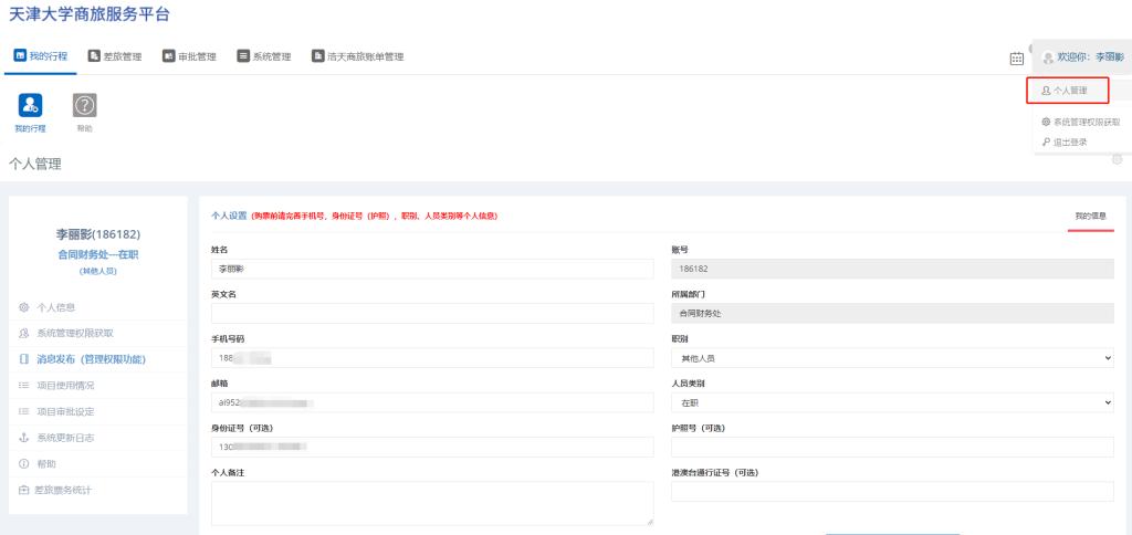 首次进入商旅平台,需要确认个人的信息。点击头像,核对个人的手机号、邮箱、身份证号是否正确,人员类型、职别信息是否准确。确认身份证号和手机号正确,方可购票。确保职别信息正确,因为职别关系到订票时个人的差旅标准。教工的人员类型默认为“在职”,离退休人员请修改为“离退”。