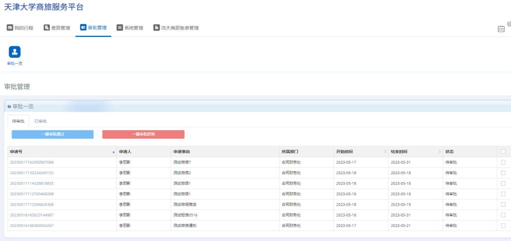 经办人完成行程申请后,审批人会收到微信的审批提醒。审批人进入商旅平台“审批管理”—“审批一览”进行审批。审批人默认为项目负责人,项目负责人可以在“个人中心”——“项目审批”,授权他人代审批或设置为自动审批。