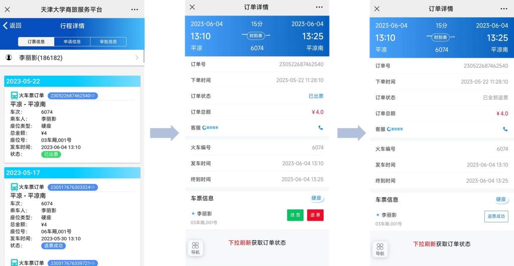 点击行程‘详情’可查看购买票务的信息。点击订单号可进行改签及退票操作。商旅平台也同时显示该票务的退票、改签信息。退改签手续费规则以购票时页面提示为准。
