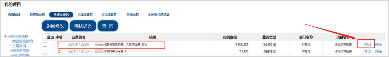取消提交成功后,到“待提交业务”中,找到相应业务,点击【修改】,修改填写报销内容和支付方式等信息,然后提交即可。重新提交后,会生成新的预约单号,需要重新打印。