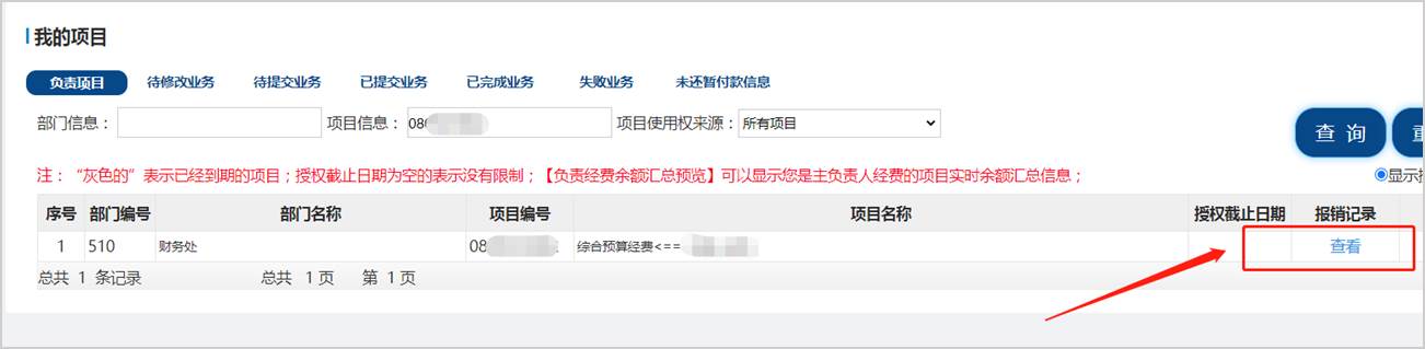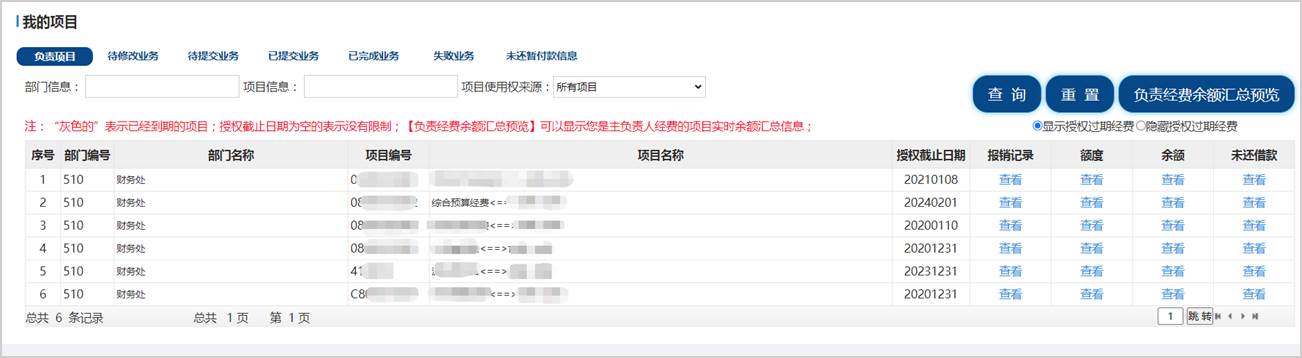 ⟡ 负责项目:展示个人负责的以及被授权“报销”系统的所有财务项目,可查看项目对应的报销记录、未还借款;项目额度和余额只有项目负责人可查看。点击报销记录“查看”可查看项目下所有的未报销单据,项目负责人可直接删除单据。