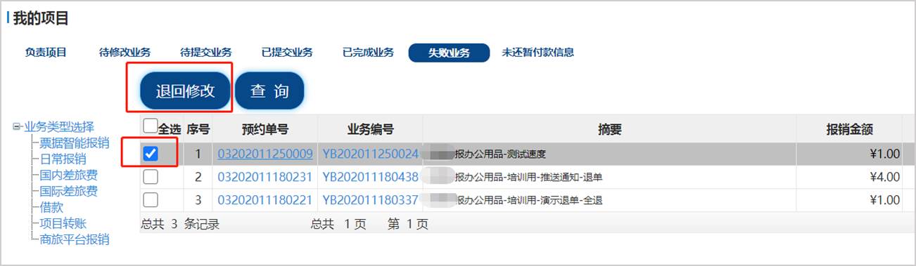 c)已投递至财务处,因预约单不符合要求被全部退单的业务,可以修改预约单后再次提交后投递。在“失败业务”中找到被全部退单的预约单,勾选前面的复选框,然后点击【退回修改】;