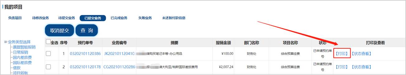 提交预约单后,如果当时没有及时打印,可在“网上报账系统”——“我的项目”——“已提交业务”中找到相应的预约单,点击【打印】。