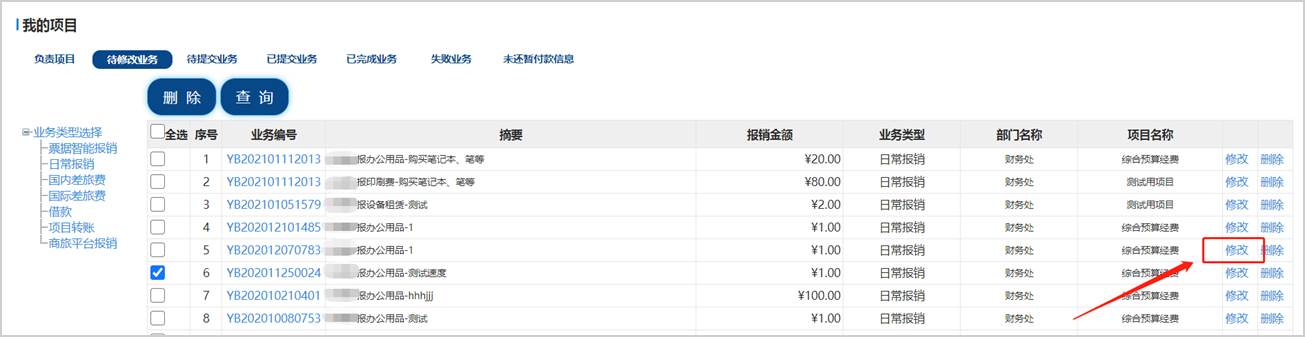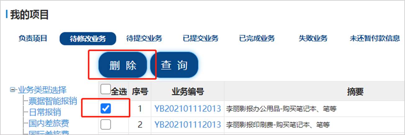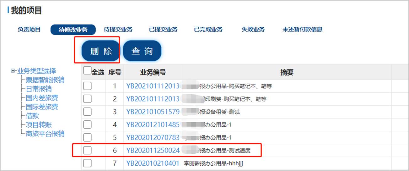 退回修改成功后,到“待修改业务”中,勾选相应业务,点击【删除】即可。