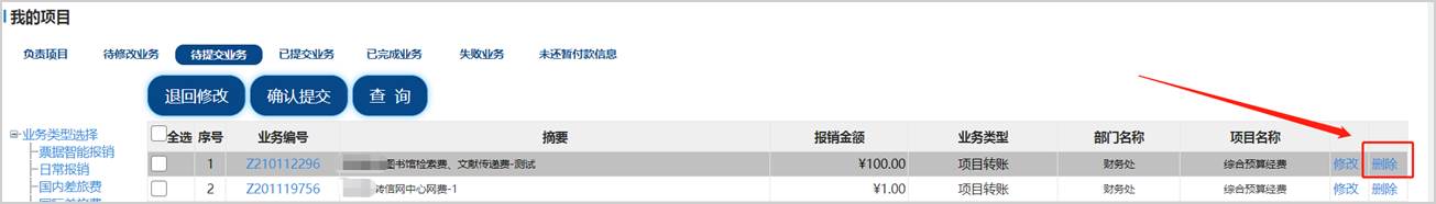 b)已提交的预约单,如果尚未被财务处接收,可以删除预约单,已接单的预约单不能删除。删除方法:在“已提交业务”中,勾选要删除的预约单,点击【取消提交】,然后到“待提交业务”中删除。