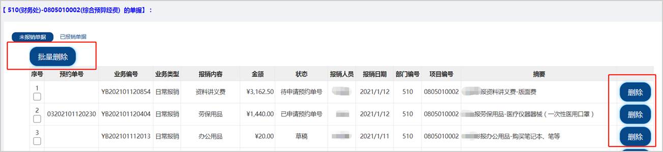 项目负责人在未报销单据查询页面,可将不需要报销的预约单删除。