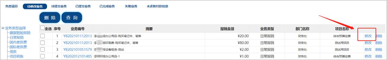 ⟡ 待修改业务:在网上报账系统填写的尚未生成预约单的业务或从“失败业务”退回修改的业务。