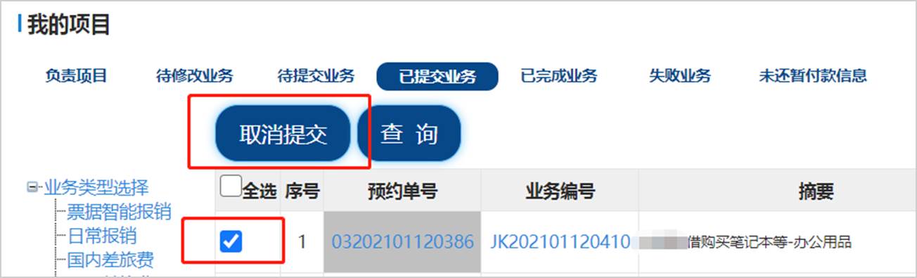 b)已经提交生成预约单但尚未递交财务处的预约单,如果想修改信息,可在“已提交业务”中找到预约单,勾选前面的复选框,然后点击【取消提交】;