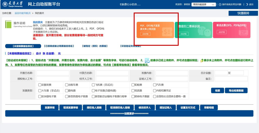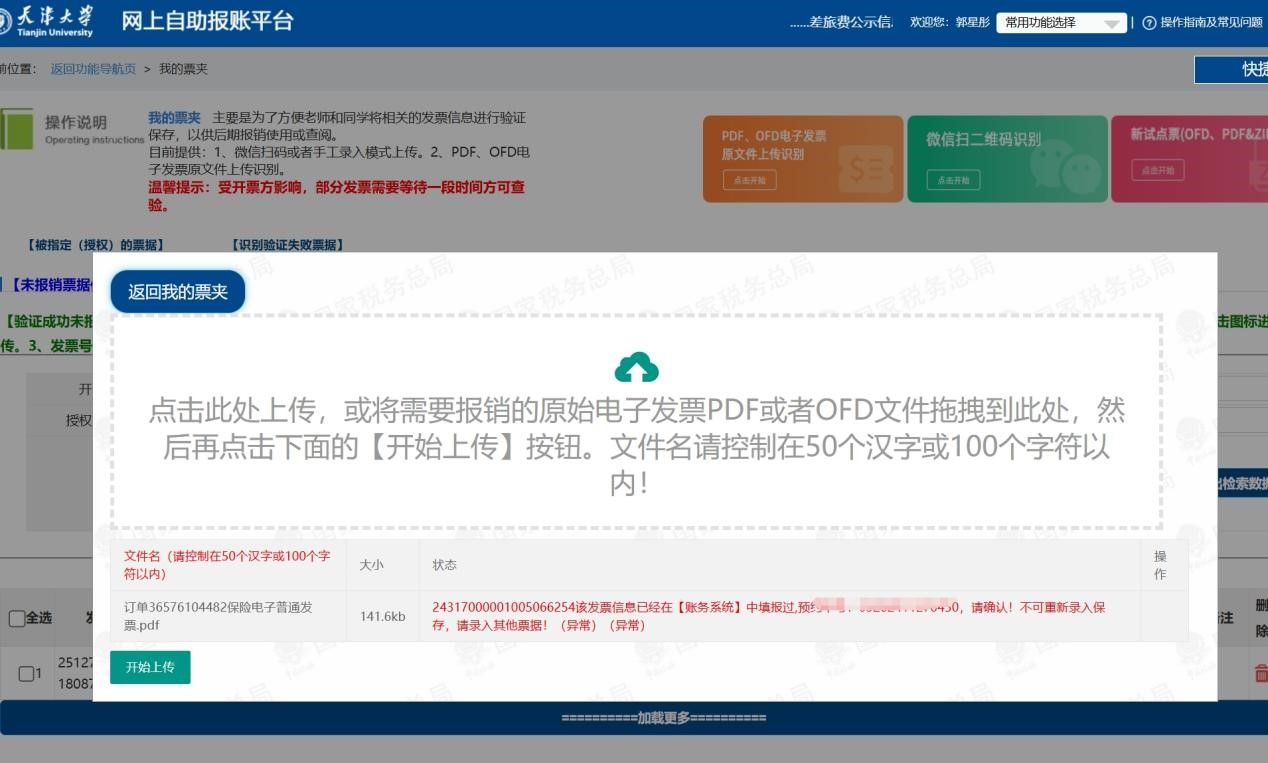 上传电子发票时进行校验发票真伪及查重认证,如果已经上传或者已经报销,会提示上传失败。