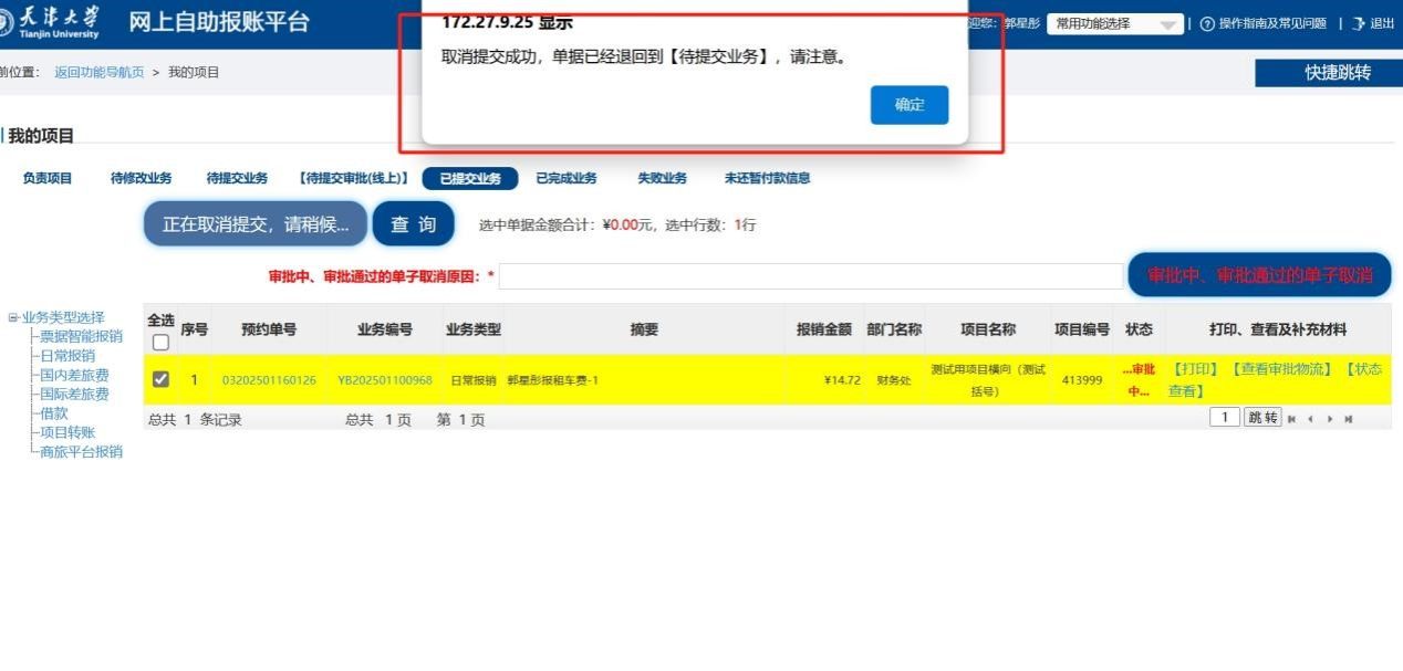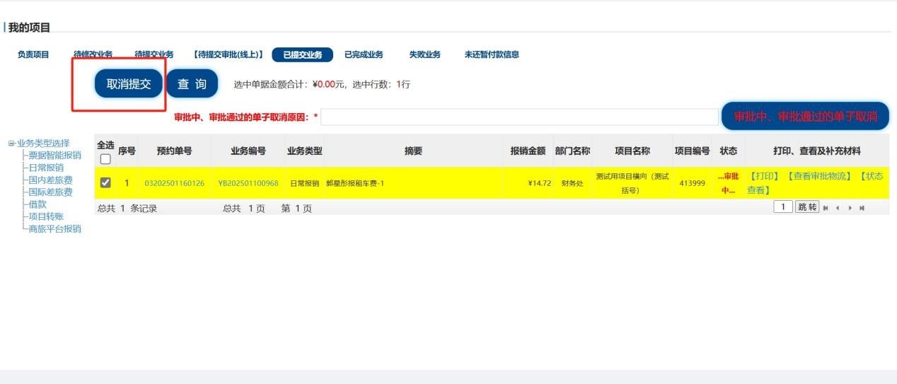 1. 报销单提交线上审批后,如完全未经过审批,可以在已提交业务中,选中该单据,点击“取消提交”按钮。操作方法与线下审批相同。审批中、审批通过的单据需要修改的,请选中单据,输入取消原因,点击“审批中、审批通过的单子取消”进行撤回。