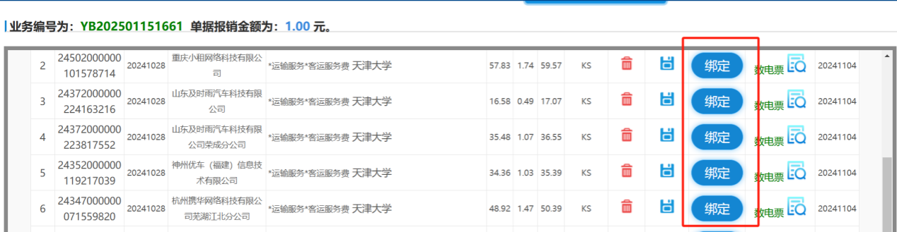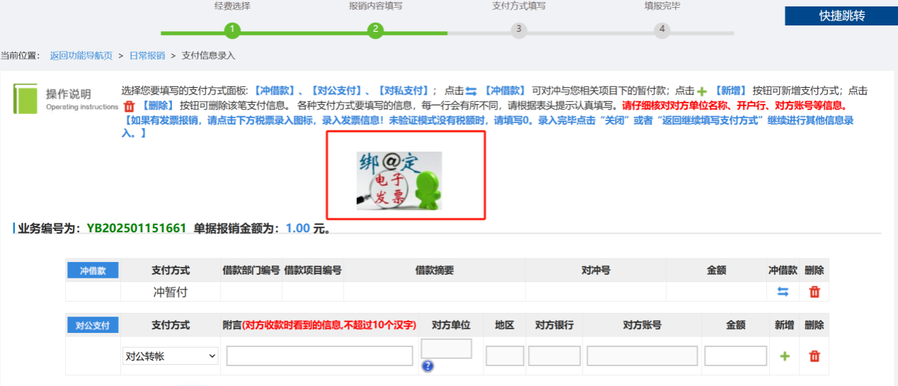 二、正常进行报销预约,最后一步支付信息录入界面,选择绑定电子发票按钮,进行电子票据与预约单的绑定工作。