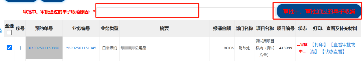 2. 审批中、审批通过的单据需要修改的,请选中单据,输入取消原因,点击“审批中、审批通过的单子取消”进行撤回。