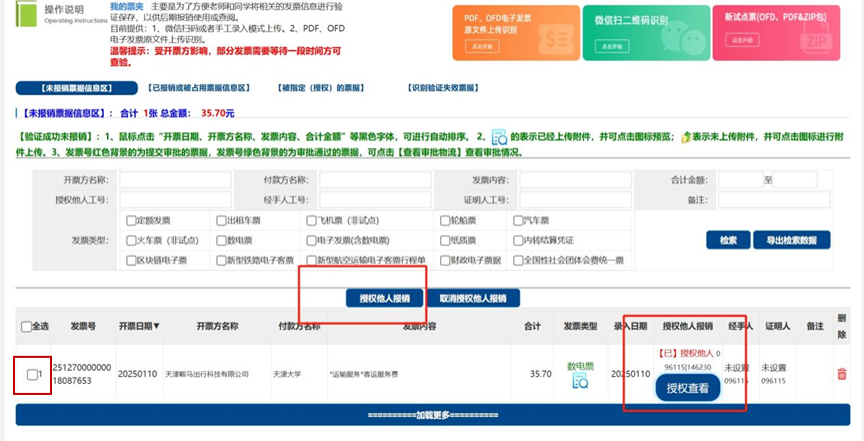 如果上传后需要授权其他人员报销,可在我的票夹中勾选需要授权的发票,点击“授权他人报销”,检索工资号或学号,进行授权。
